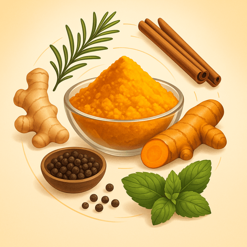 Turmeric’s value in natural wellness is well-deserved, but its full potential emerges most clearly when it works alongside other supportive herbs. Black pepper enhances absorption, ginger boosts circulation and digestion, boswellia complements joint support, holy basil helps balance stress, and milk thistle nurtures the liver.